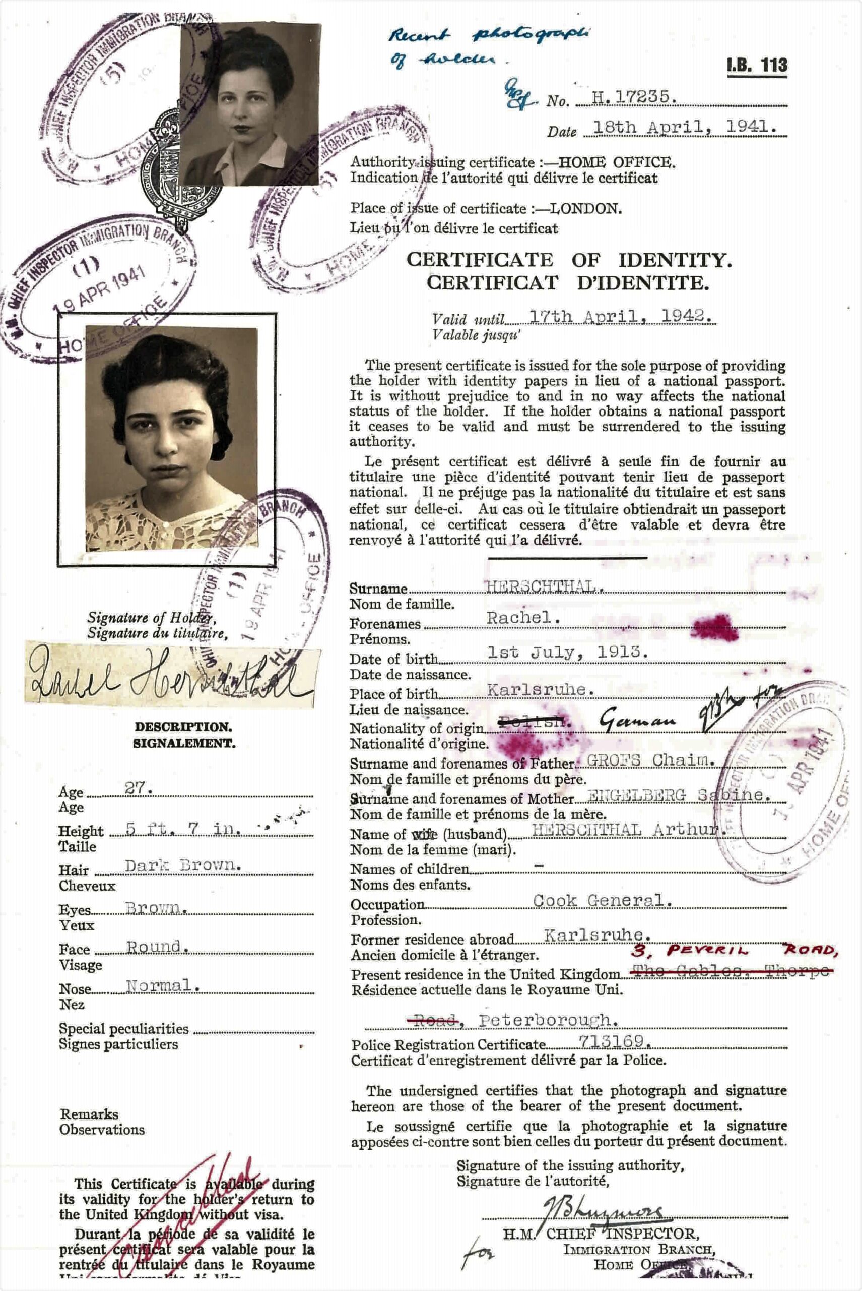 Once the war started, being located near the coast was perilous, so Rachel moved to London and worked for a family who owned a fish and chips restaurant. For those in the Kitchener Camp like Arthur, if they had not joined the war effort they were either imprisoned in internment camps or deported. Arthur was sent to the Isle of Man which housed the large Mooragh Internment Camp. In January 1941, he was released and came to live with Rachel in Peterborough, a small town near Cambridge where she lived and worked for the Baker family. Eventually, Rachel started taking beauty classes and got a job as a hairdresser. The young couple remained in Peterborough for another six years as stateless refugees, “counting the days” until they could leave.