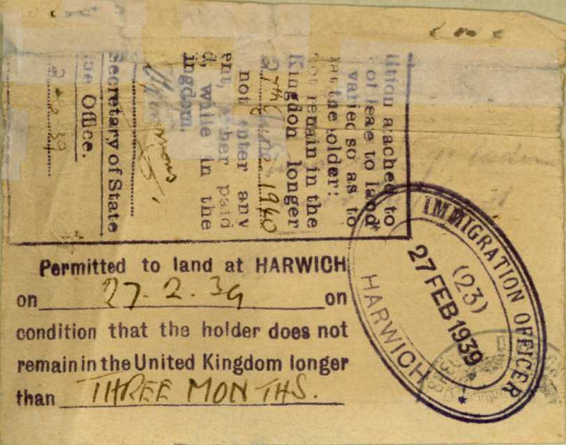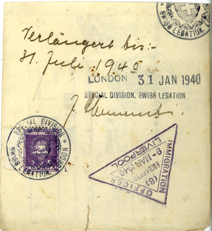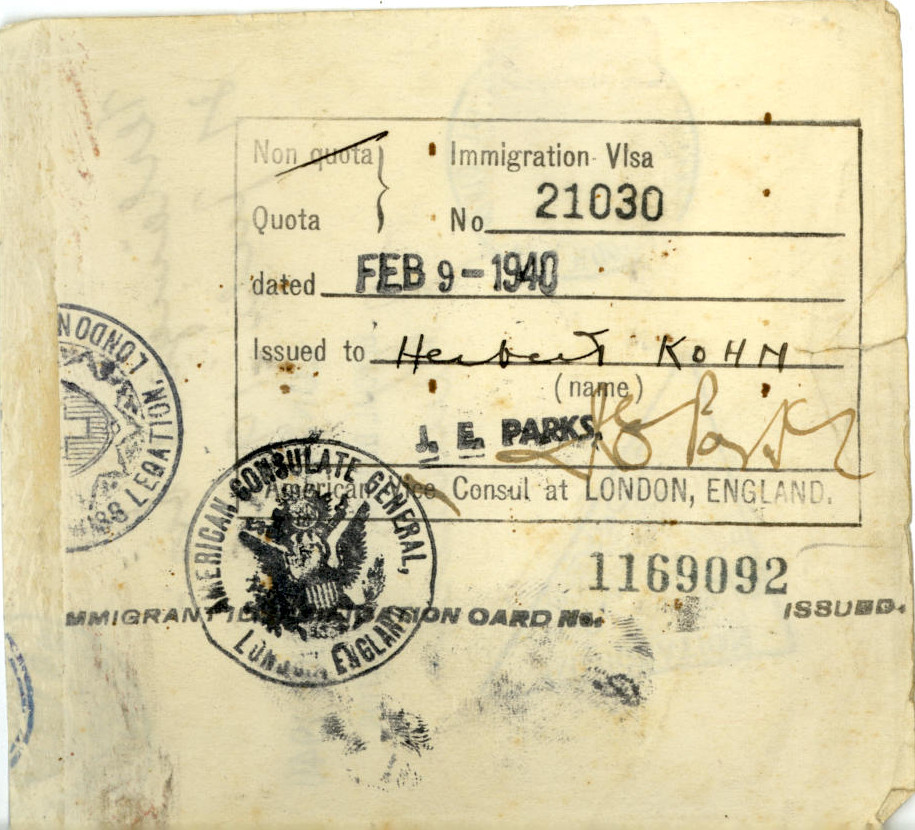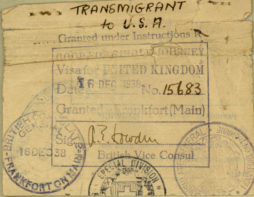 During the events of Kristallnacht in November 1938, Leo was forcibly taken from his home and sent to the Buchenwald concentration camp. Irene decided instantly that if he ever returned, Leo needed to leave Germany immediately. She reached out to a distant cousin in London who sent back a telegram agreeing to provide £2 a week for Leo. Irene brought the telegram to the English consul in Frankfurt who stamped not only Leo’s passport but the passports of the entire Kohn family with visas to England.